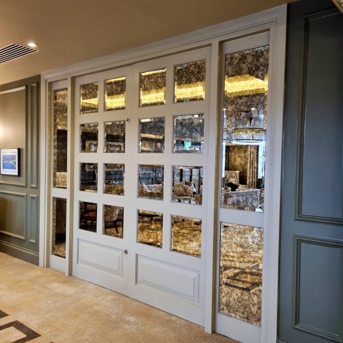 This stunning mirror installation demonstrates how antique mirrored panels can add both depth and character to a space. The distressed mirror finish complements the classic yet luxurious aesthetic of the hotel, creating an atmosphere of timeless elegance. Beyond aesthetics, these mirrors subtly extend the visual depth of the room, making intimate lounge areas feel more expansive while enhancing the warm, ambient lighting.