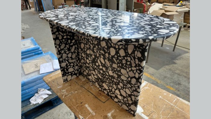 The Rocksteady Table takes shape in the workshop, showcasing its bold surface and solid stone craftsmanship—built to bring attitude, rhythm, and durability to Virgin Hotel Shoreditch
