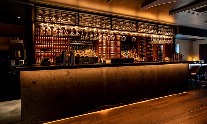 Set within a semi-rural location in Brentwood, the sites exterior has been redesigned to deliver an attractive and appealing presence that echoes the sleek and sultry look of the interior scheme. The existing entrance to the restaurant has been relocated, a new double height glazed atrium now offers impressive views into a beautifully lit lobby space. Enveloped in a traditional shiplap cladding, the façade is softened by layers of intricate golden manifestation that have been designed to reflect the natural light whilst creating moody internal shadows.