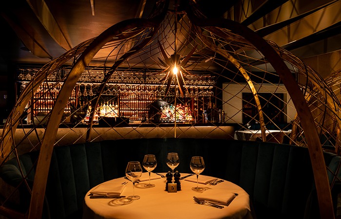 A sculptural helical staircase crowned with a striking chandelier of knitted wire orbs captivates guests as they enter the restaurant. The bespoke lighting creation created by Brighton based artists Steven and Amanda Follen references a subaquatic feel, which has become a dominant design narrative throughout the scheme.