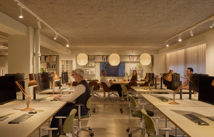 “A lightless, low ceilinged former postproduction studio, we saw an opportunity to do everything that we couldn’t do upstairs, downstairs – and show how basement spaces can be thoughtfully designed to be viable workplaces. We decided that every design decision we made down there would somehow improve on our current office – bigger desks, better acoustics, more privacy. But most importantly, we wanted to enable the practice to build relationships with our suppliers, and to explore and showcase some of the interesting and sustainable innovations coming to the market – something that we had no space to do upstairs.”