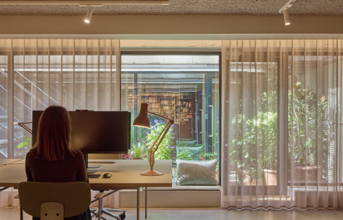 The perimeter walls layer tactility and acoustic performance. Focus booths are lined with fluted, highly absorbent acoustic panels by The Collective, produced from 80% recycled plastic bottles, while lightweight joinery by Zen Joinery introduces precision and warmth. Kvadrat’s Daybreak curtains at the shopfront diffuse daylight into the studio, and Divina fabric frame the rear wall and focus area, completing a soft and cohesive envelope that complements the calm, residential-inspired character of the interiors.