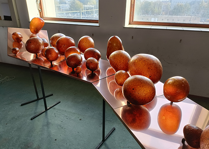 Design hotel Kazerne in the centre of town never disappoints in it’s showing of cutting edge and high-end design installations. The permanent space oozes style in every room, from the bar and restaurant and beyond, and this year the central exhibition Magnetic Moment really caught the eye. Curated by Kazerene director Annemoon Geurts with scenography by design agency Rive Roshan, the group show was designed to create a space in which visitors could step away from the sense of burgeoning dystopia in which we live, to find moments of peace, calm and wonder. The collection of work, which were dimly lit and relatively minimal in aesthetic, were intended to stimulate a sense of suspended time in which nothing is yet predetermined and contemplation for a more positive future may exist. Lumus Instruments soothing orange circular light moves via an algorithmically generated sequence played out by internal filaments, whilst Lucas Vito’s tall fluted Buoy Lights are made from 3-D printed corn starch, and create a sumptuous linear glow.