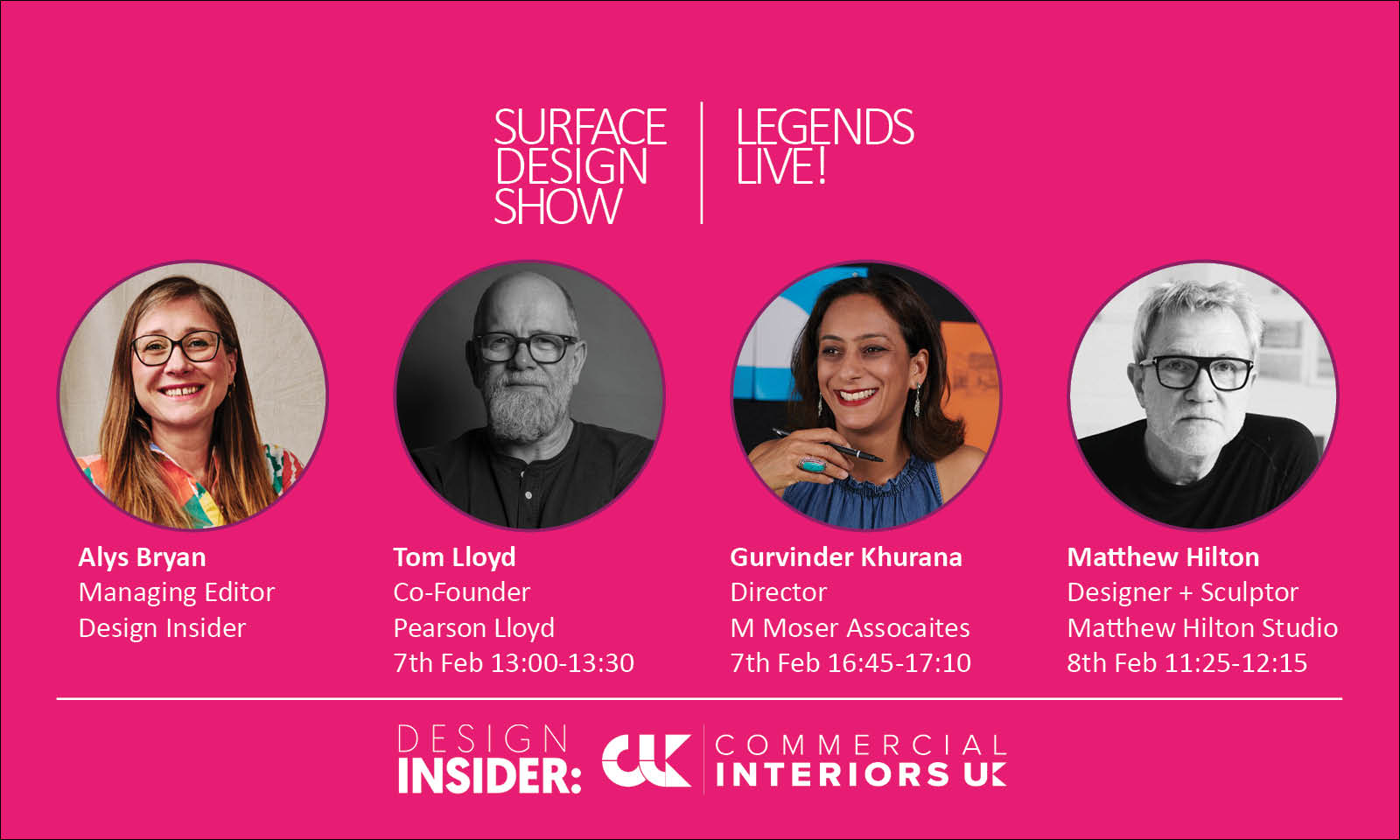 I’m Alys Bryan, Managing Editor of Design Insider, and this year I’ve had the pleasure of being chosen to host the Legends Live series at the Surface Design Show. This opportunity is an honour, a chance to engage in meaningful dialogues with the pioneers and influencers who’ve not only shaped our industry but have also played a pivotal role in my professional journey.