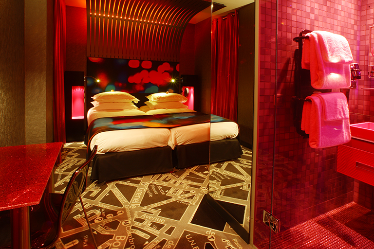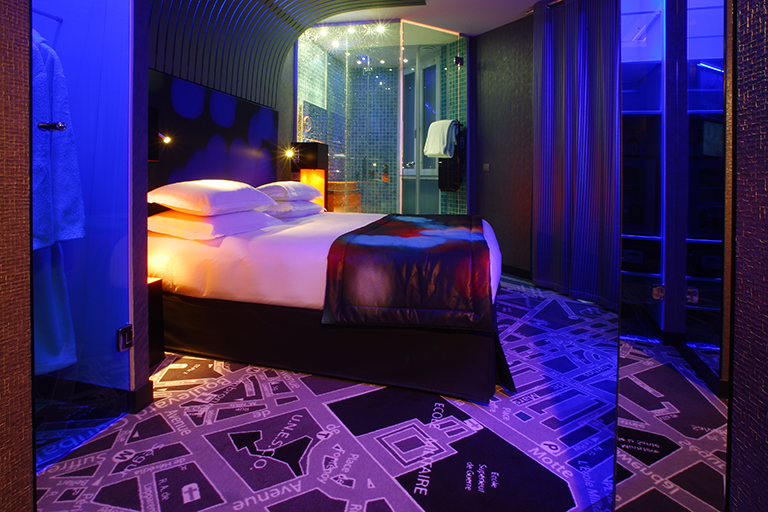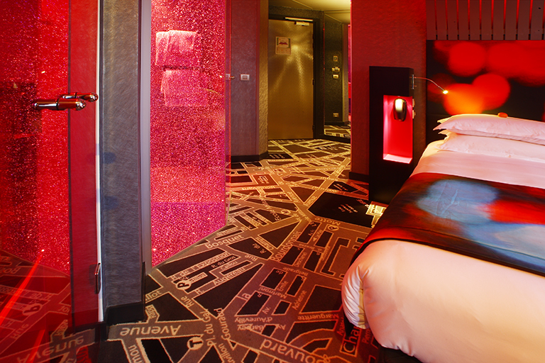 A striking combination of carpeted pavement, bright, neon lights and headboards shaped as underground tunnels contributes to making a stay at the Hotel Sublim Eiffel in Paris a truly unique experience. The interior design of the hotel perfectly succeeds in capturing the outside magic of the city, leaving behind a lasting impression. Carpets by ege play a significant role in the interior.