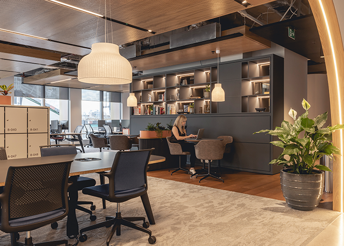 “The successful integration of technology was also a major piece of the brief” Sarah Dodsworth added. “This is a client who really does invest in making technology work for its people, rather than paying lip service to the latest products and trends. Every single meeting room is VC-enabled, for example, whilst the ‘plug and play’ transitional areas between tea points and desking zones all feature Microsoft Surface Hub technology, using screens on wheeled stands, which make these areas properly effective as idea-sharing spaces. Several screens can also easily be brought together for Town Halls if required. In the quiet rooms and booth areas, tech controls – so often a barrier to a good design solution – are integrated discreetly into sideboards, which means people can relax in a comfy armchair and still take part in a Teams or Zoom meeting.”
