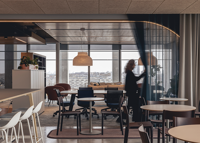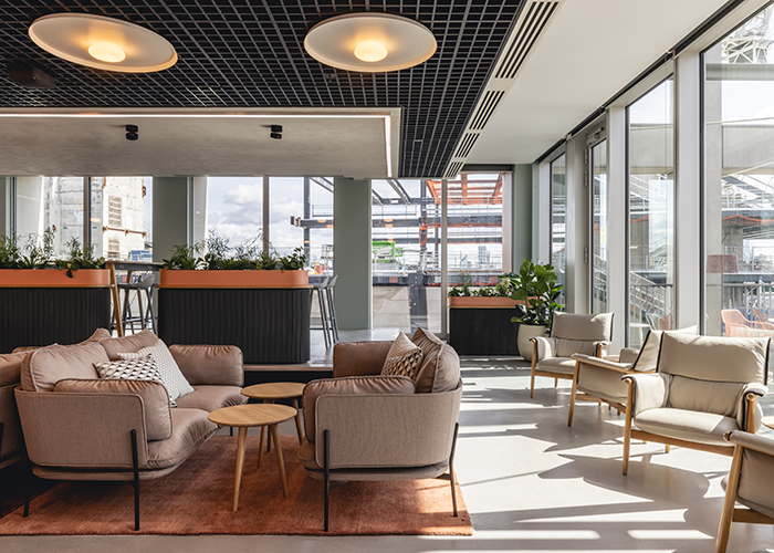 In the large café and social area, a mix of soft and wooden furniture is complemented by mobile planters on castors, tying in with the material language of the workspace and allowing the space to be fully flexible for the various town halls and client events that would form part of its everyday life. Huge bi-folding doors open out onto the large, south-facing balcony/ terrace area, with plenty of outdoor and transitional furniture and offering incredible panoramic views of the capital.