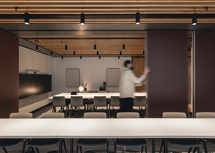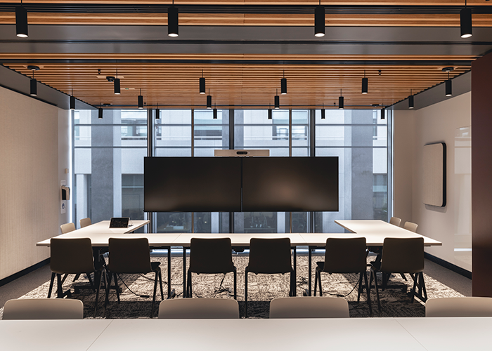 In the main office area, suspended ceiling systems have been cleverly modified – a bespoke design by Ekho Studio to mimic the look of mesh, which was a way of offering an impactful finish without breaking the budget. Timber bulkheads are also bespoke and are amongst the feature elements that really impact on the atmosphere, aesthetics and acoustics within the open office areas.
