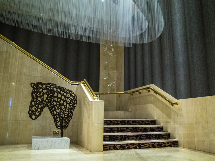 The metal horse sculpture is based on the profile of the famous racing horse Red Rum, who opened the hotel. Actual forged iron racing horse shoes were used to create the sculpture. A template was made in timber to ‘sculpt’ the shape around.