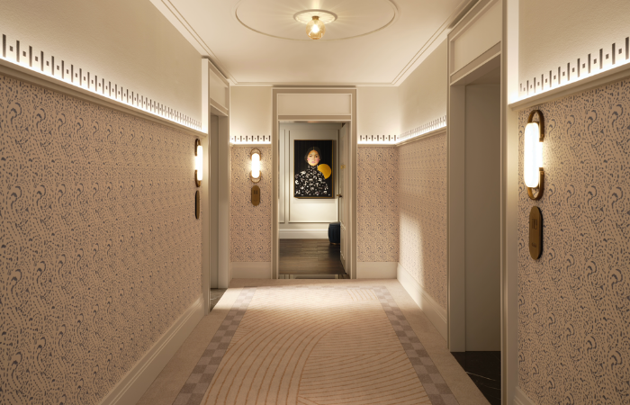 “The carpet in Klimt room represents the movement of the Viennese waltz, while the Schiele room adopts a more structured, geometric language. The corridor carpet has reference to the historical checker tile pattern that was there originally. Together the designs echo the rhythm of the architecture and lighting, creating a seamless and elegant guest journey.”