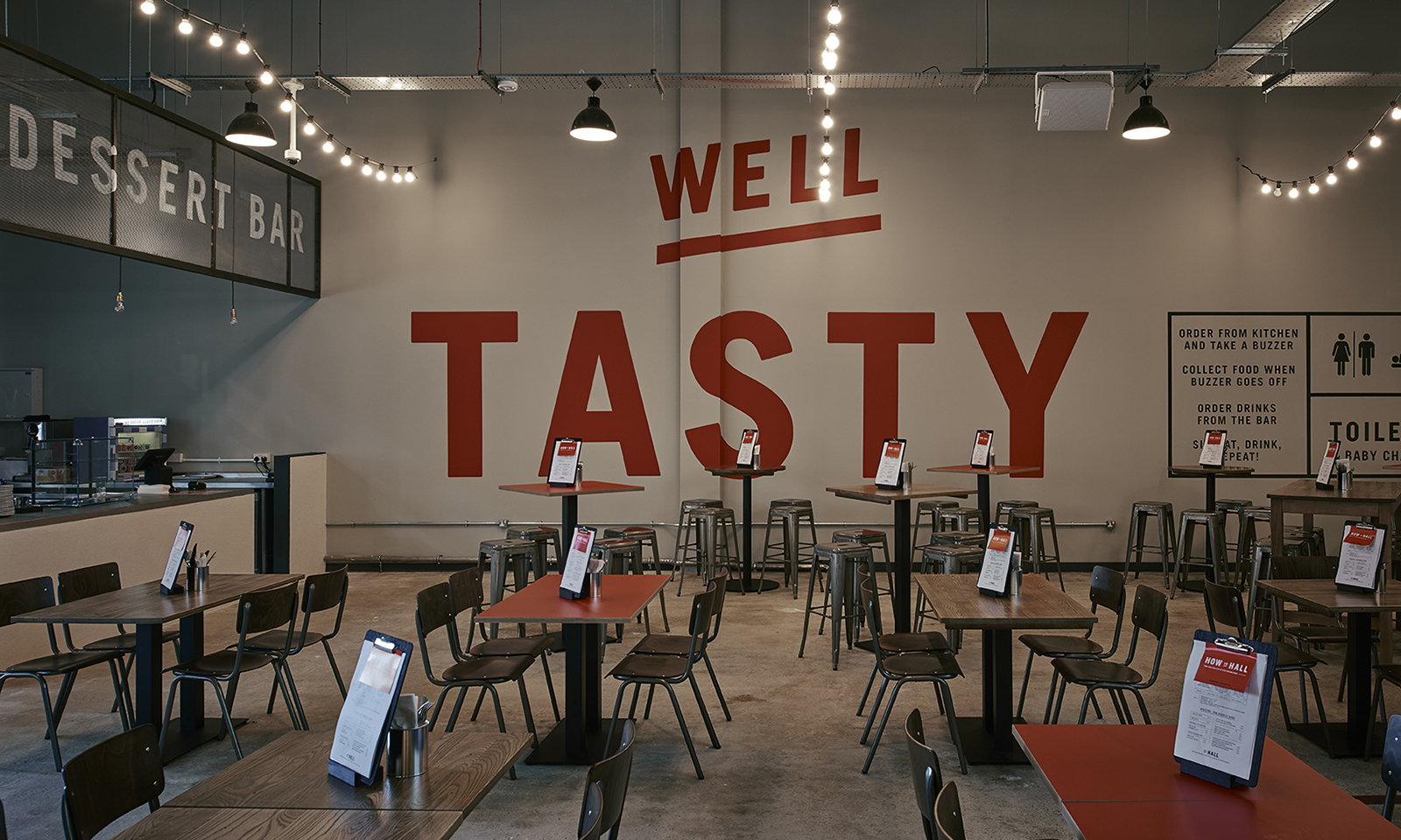 Project management and fit-out experts Styles&Wood built six kitchens, a coffee shop, a food truck pop-up stop, two bars and a canteen style seating area for 680 people. Award-winning interior design consultants SpaceInvader, worked closely with Market Halls to deliver their creative vision. Taking an industrial approach, the space created not only communicates the values of the Market Hall brand, but also acts as a supporting backdrop to showcase and enhance the individual food traders.
