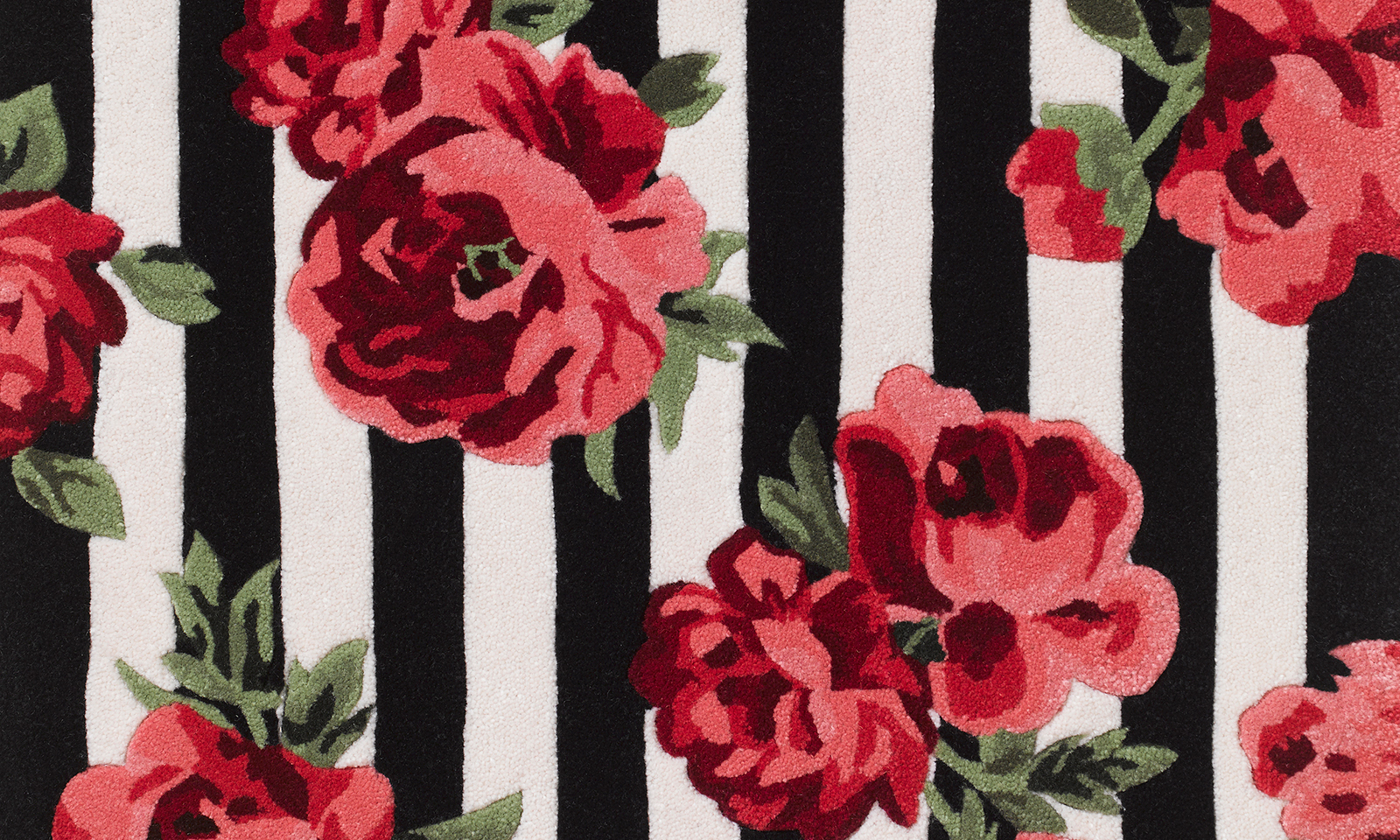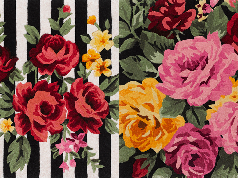 Blossoming oversized roses in vibrant pinks, reds and yellows decorate each design. The use of graphic monochrome stripes offers a bold contrast.