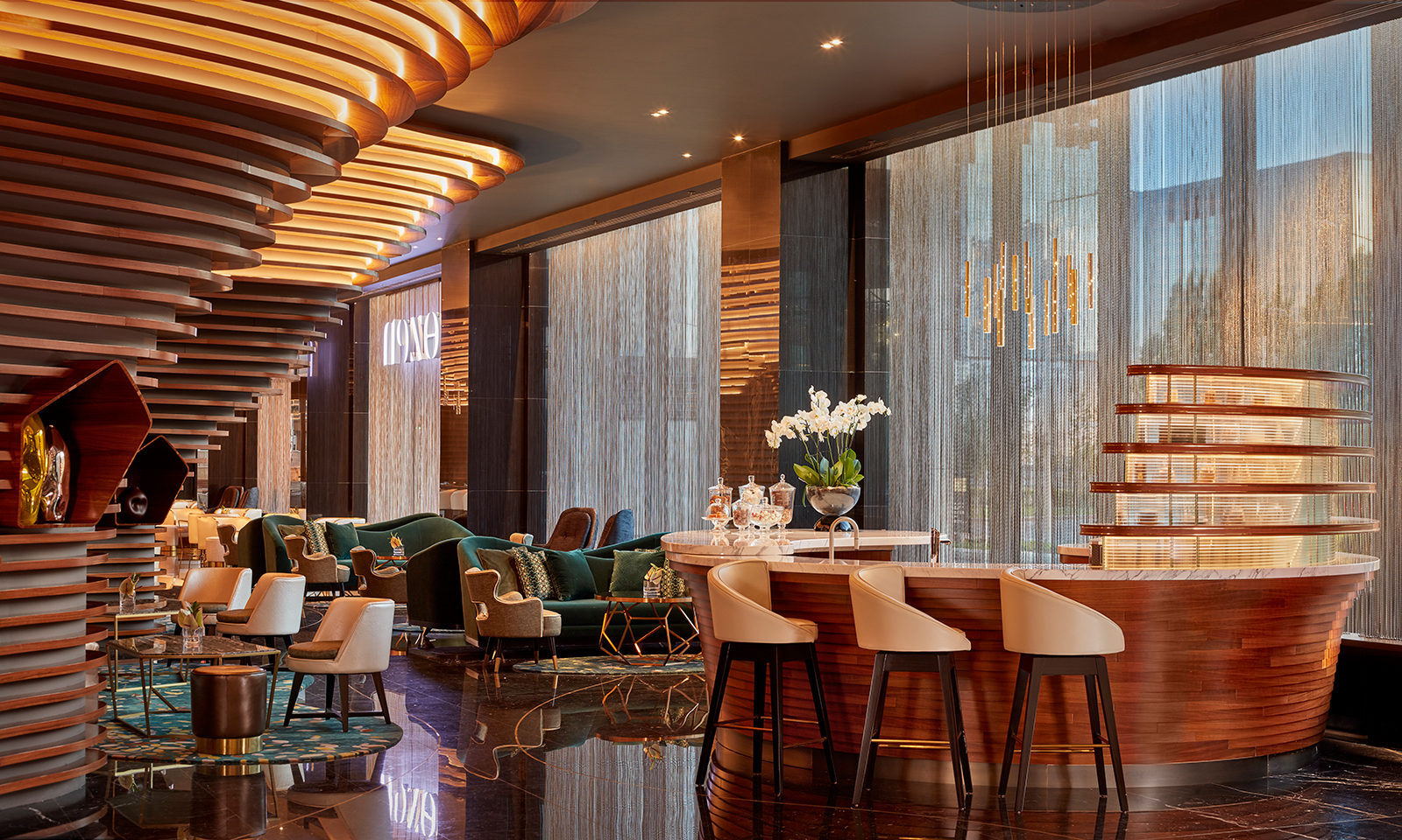 Feature wall panels with illuminated features inspired by petrified birch trees create a beautiful decorative back drop to the reception areas, whilst the wall in the Ozen lobby lounge has carved out recesses, inspired by the organic stratified structure of the Mangystau mountain region of Kazakhstan, to add a sense of privacy.