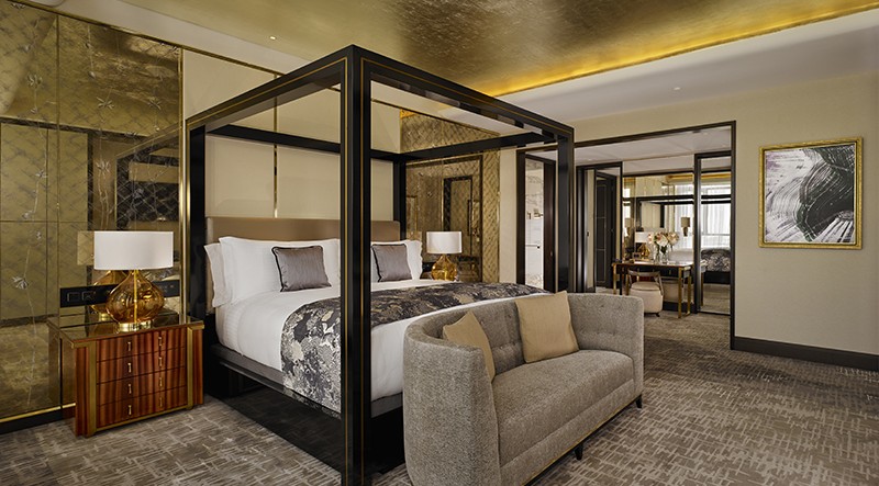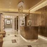 Organic shapes resonate throughout the property, giving the hotel a unique sense of flow. Other notable design features include the flooring in the reception of the hotel that has an inlaid metal floral pattern, which radiates from the base of the dramatic feature staircase and the fossilized trunk sculpture by Jon Krawczyk.