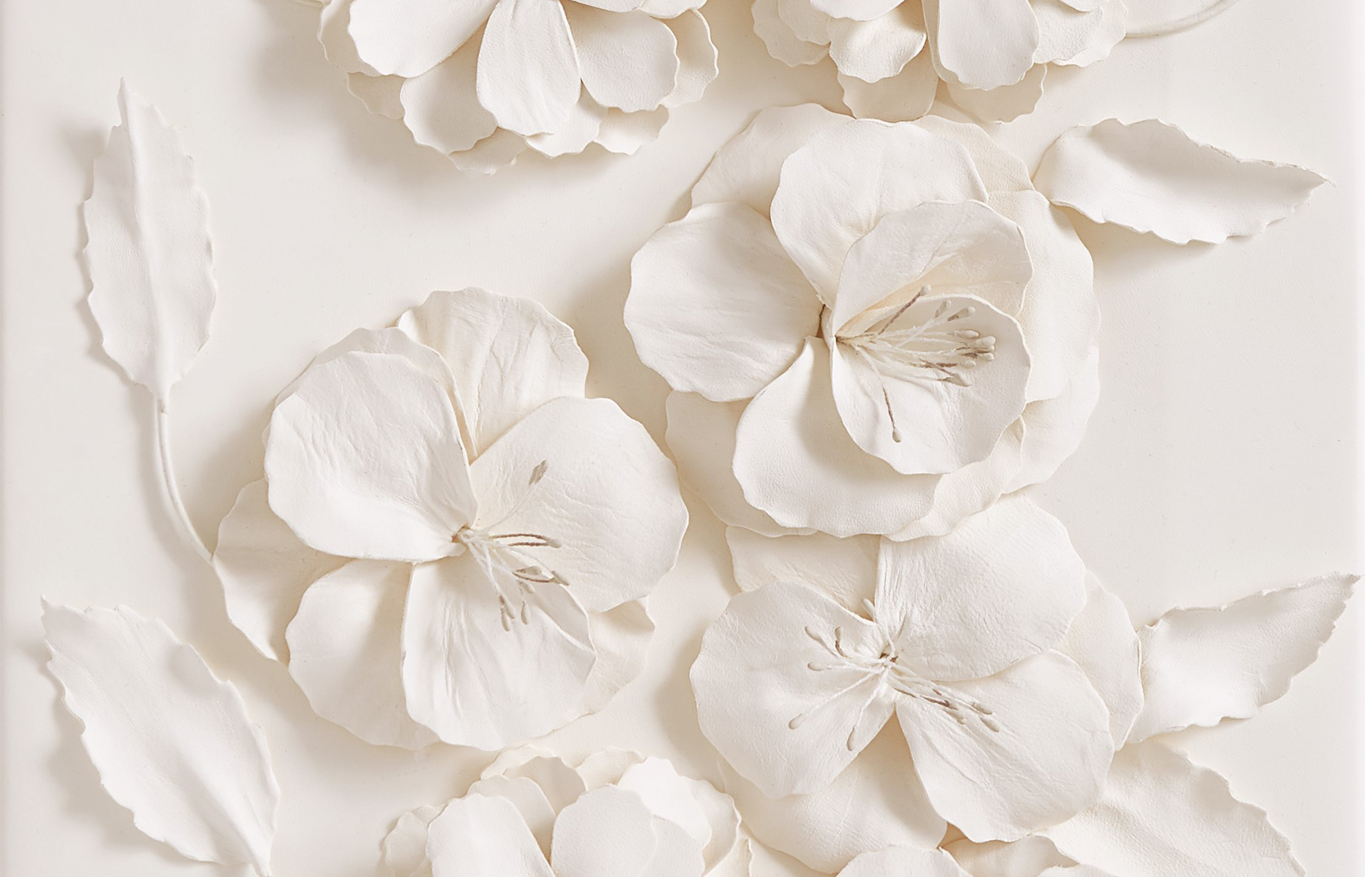 I have always had a love of leather, and the development of techniques we offer has been inspired by my love of fashion and in particular couture design. It might be a detailing on a gown or the woven handle of a handbag that inspires a new product, I enjoy taking this noble and ancient material and seeing where creativity and innovation can lead us. One of our most recent leather surfaces was inspired by a discovery of the softest, pure white lamb nappa at one of the tanneries we work with. Knowing that it was unlikely anyone would buy white nappa I set to find a way to use it. We supply fibrous plaster, the traditional floral and foliage designs used on cornicing and ceilings and we took this as inspiration and recreated it using the white nappa. The flowers are created by water moulding techniques yet maintain the delicate nature of the foliage. This means a room could feature traditional plaster decoration at celling height, but that this intricate moulding, perhaps featuring grapes or flowers can tumble down the all into a the room, but in a butter soft nappa leather finish. It is the development of unique surface finishes such as this, which inspires and delights us.
