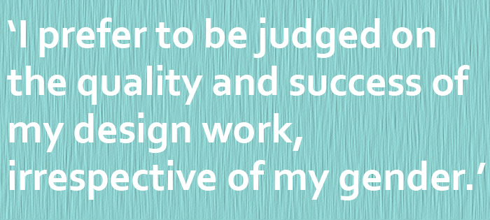 ‘We have a good proportion of women in our design and senior management teams, all of whom have been appointed on merit. This is a topic that surprises me and could potentially diminish women. I don’t agree that there are special difficulties if you are a woman in design – not as long as you are professional and committed to your work. Personally, I prefer to be judged on the quality and success of my design work, irrespective of my gender.