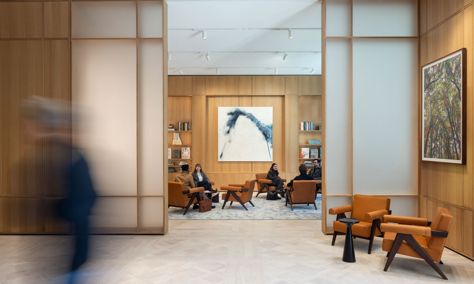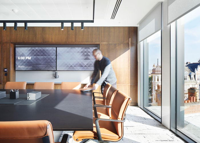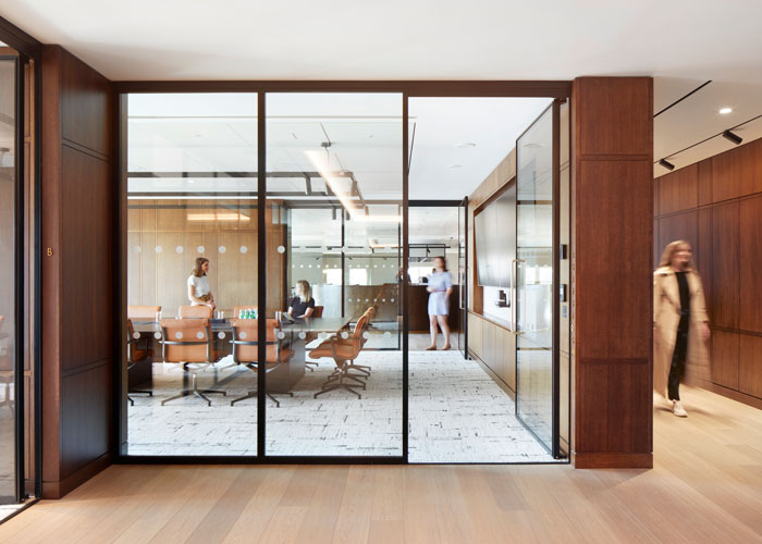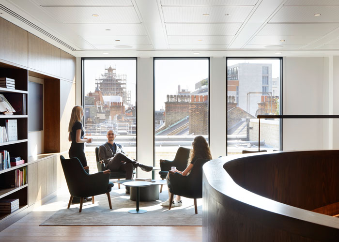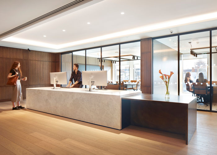 The 27,000 sq ft workplace combines textures and tones to create a contemporary, understated aesthetic reflecting the discreet nature of the office in this premium London address.