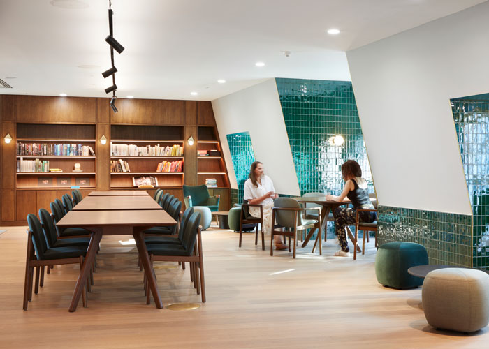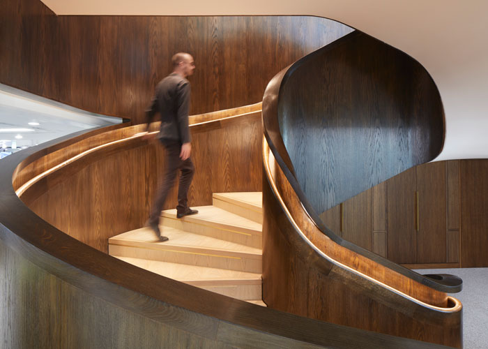 The workplace is designed for new styles of working, with nooks and phone booths within the timber volume of the core, including a ‘secret meeting room’ with backlit timber joinery and a bespoke inlaid meeting room table by British heritage manufacturer William Hands. Other specially designed joinery details including stools that tuck away into the body of the banquette, designed for flexible, collaborative working.