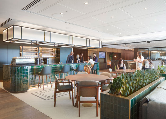 The upper level, connected by the feature staircase, hosts amenity spaces including tea-points and a feature bar. With a moody, tonal palette suitable for hosting everything from a morning coffee function to an evening drinks event, the bar forms a work and social focal point to the workplace.