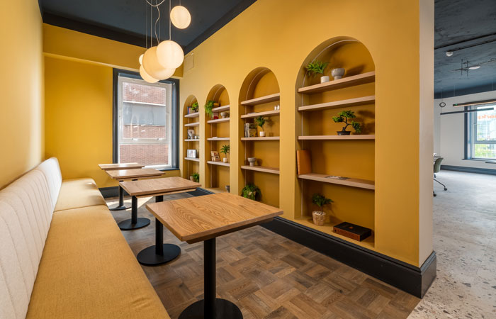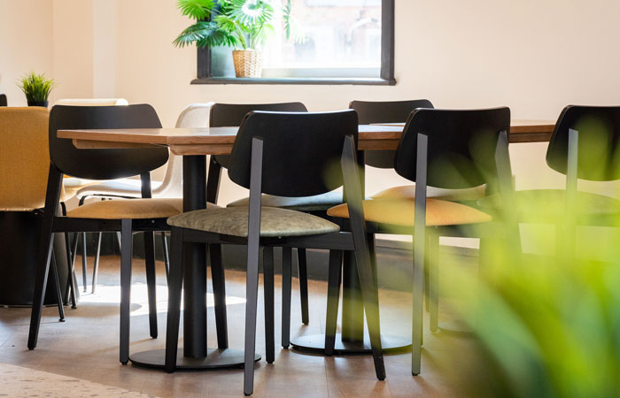 The co-working site also boasts a café – a sunny corner with deep yellow walls and geometric tiling details, it features bespoke furniture and pieces from the main Furniture Fusion collections. The Alma dining chair has a vintage, mid-century look which has proved a real hit over recent years and is seen here with a solid beech frame stained to black and a seat upholstered in a bold mustard yellow woven fabric. This popular piece works well in a range of commercial interiors looks great in this workplace alongside Furniture Fusion’s small dining tables topped with solid light oak. Elsewhere, the fi rm’s Roller dining table has been installed in two different sizes – part of a collection of tables and stools which share a playful, distinctive silhouette.