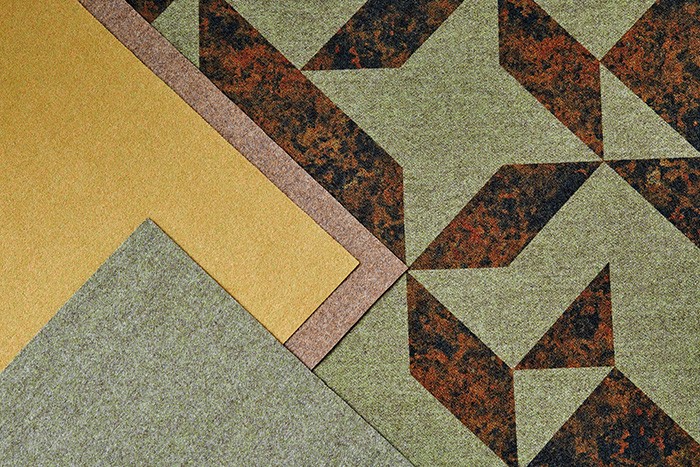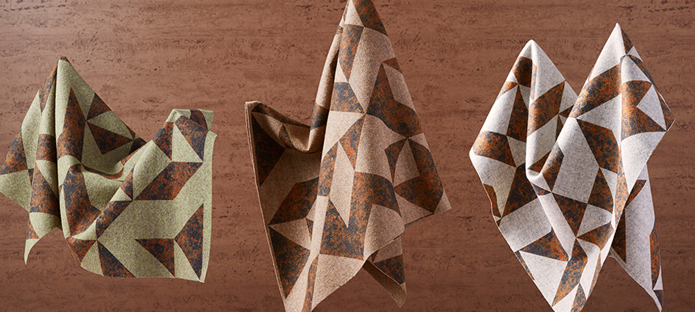 Designed by Torunn, Corrosion is printed onto Camira’s wool blend fabric, Synergy, and explores the process of natural decay and textures with geometric triangles, exploring the mix of pattern, rust and hard cut shapes.