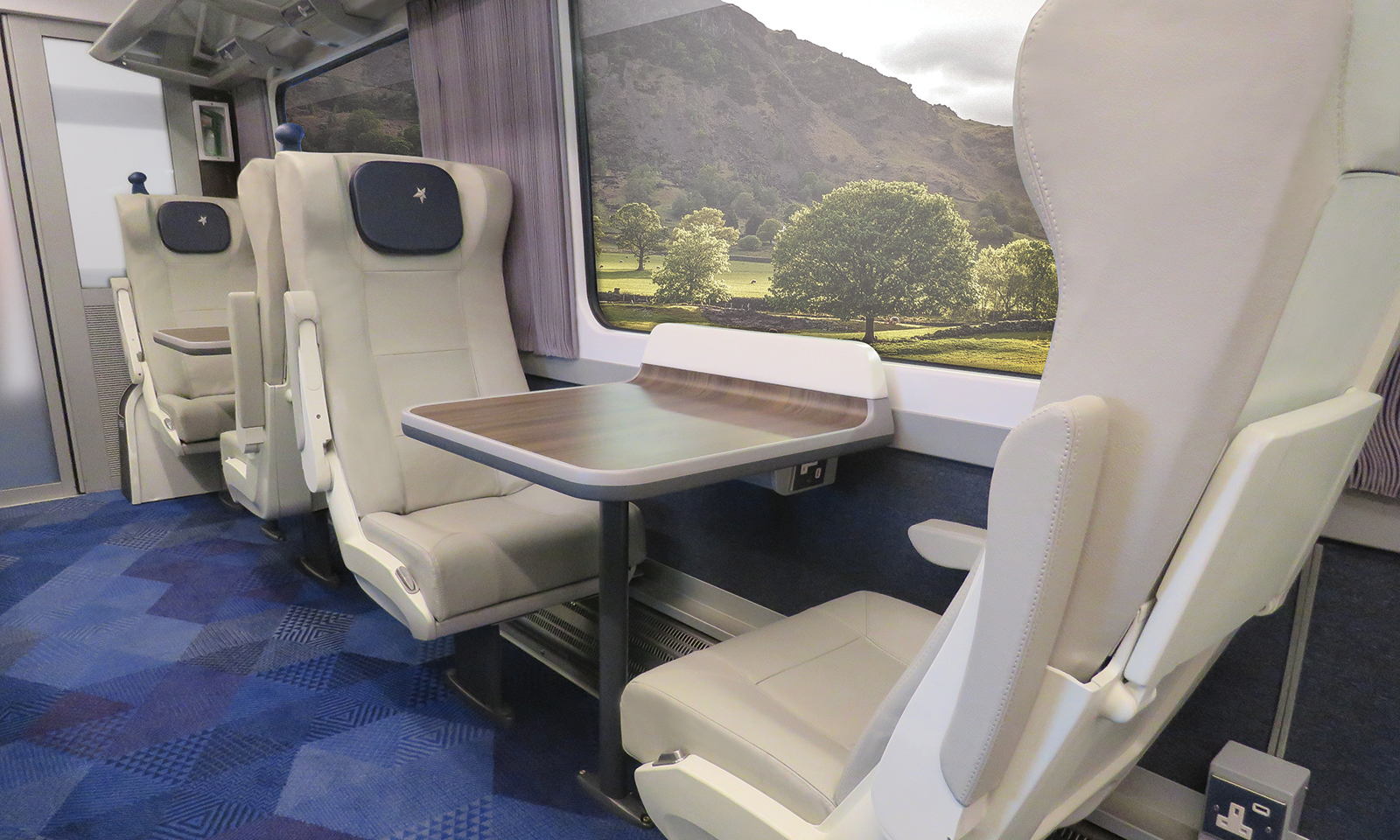 The refurbishment was taken on by DGDESIGN in Derby, and the new carpet brings a contemporary feel through the use of an on-trend geometric pattern using shades of blue that catch the eye and perfectly complement the first class leather and standard class fabric seats.