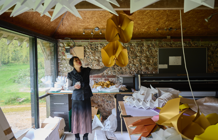 Crafted from Tyvek, aluminium, integrated LED lighting and architectural fixings, each form is hand-folded from a single sheet of paper up to eight metres long. A key technical challenge – suspending the work without sagging – was solved by integrating the lighting system along each piece, providing illumination and structural support simultaneously.