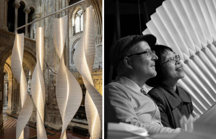 The gravitas and quietude of St Bartholomew the Great were central to the design. The church’s stone architecture offers a contemplative, almost zen-like atmosphere, allowing visitors to hear their own thoughts and sense the passage of time. Fung+Bedford translate this into form through repetitive folding and sculptural gestures inspired by sound waves rendered three-dimensionally. The installation activates the space while maintaining serenity, unfolding moments of calm through mindful repetition and spatial rhythm.