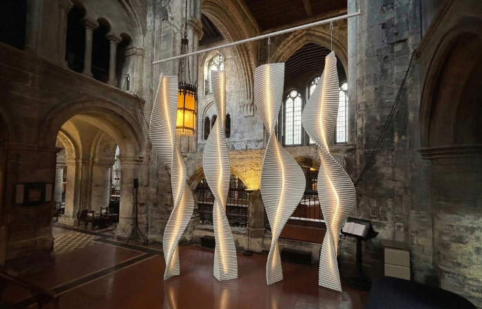 For Clerkenwell Design Week this May (19th–21st), design studio Fung+Bedford presents Resonance, a luminous, large-scale installation suspended within the nave of St Bartholomew the Great, one of London’s most ancient and atmospheric churches.