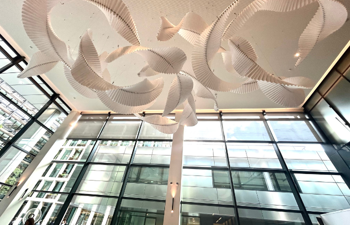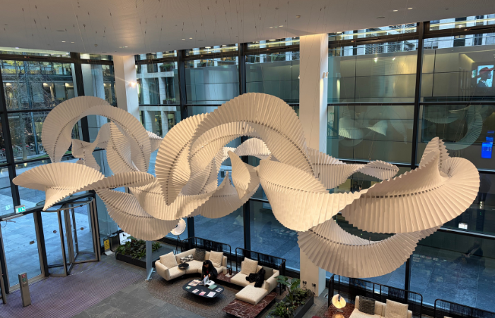 Suspended within the reimagined ground floor of 5 New Street Square, CONFLUENCE – a monumental origami-inspired installation by Fung+Bedford – transforms the building’s reception into a moment of quiet wonder amidst the energy of the City of London.