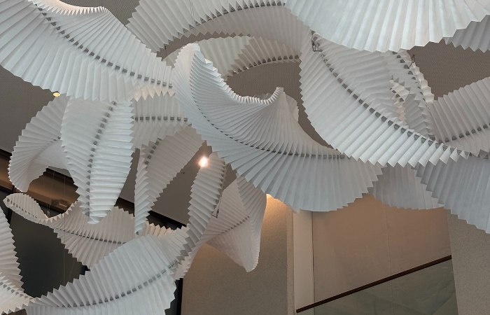 Commanding attention the moment one enters the 8.9-metre-high reception, CONFLUENCE appears to float effortlessly above the lobby. The sculptural centrepiece is composed of more than 14,000 hand-folded elements in paper, Tyvek, extruded aluminium arcs, stainless steel cables and fixings, and zinc-coated base metals – materials typically associated with motion, reimagined here in a state of suspended stillness.