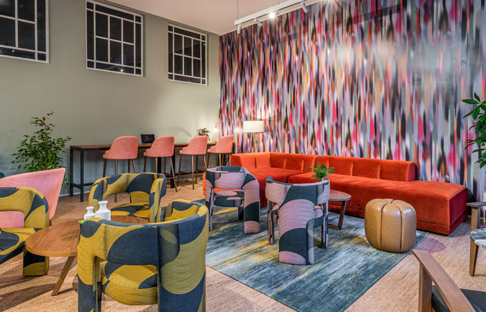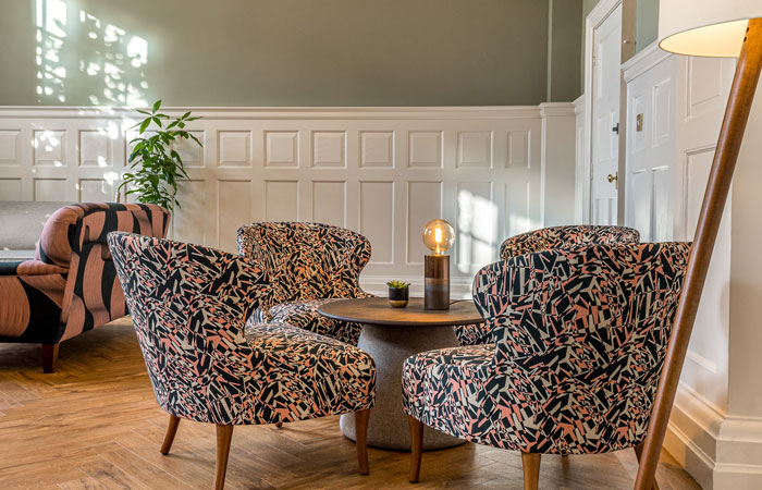 Smart design makes the most of the space and shows how well contemporary furniture, bold colour and even bolder print can work in a heritage setting. High ceilings and a generously proportioned room are a perfect site for large pieces like their 3.5m L-shaped sofa – upholstered in beautiful burnt orange velvet fabric, it provides plenty of space for students to relax with friends or prepare for lectures.
