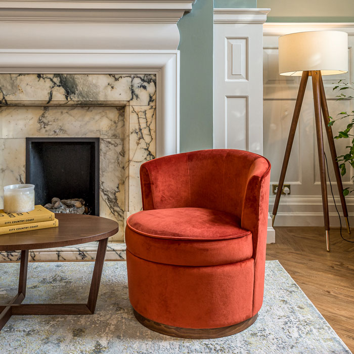 The Camelia lounge chair is used again here, upholstered in sage green fabric, and positioned alongside the Terp table. In addition, the Lillian chair looks fantastic in Sunbury Madison burnt orange velvet – the Furniture Fusion team loved the bold colour against the muted paintwork and soft lighting.