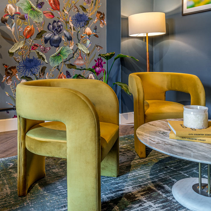 The bespoke Lara lounge chair looks fantastic in this beautiful ochre yellow velvet from Agua Fabrics – it’s a real statement piece that works brilliantly against the bold botanical wall covering.