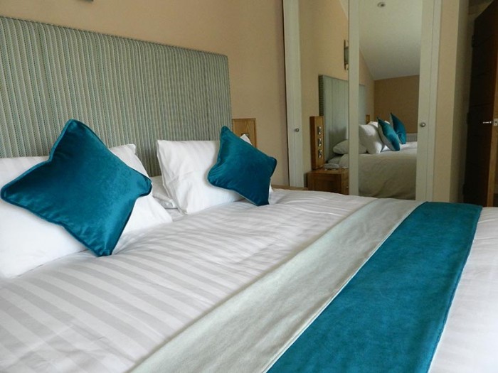 A new extension built at the rear of the property with 7 letting rooms on the ground floor and 3 self-catering apartments on the first floor. These consist of Lounge/Dining room, Kitchen, Bathroom and two bedrooms. John was looking for a modern clean looking soft furnishings suitable for a varied type of visitor. Gailarde were able to offer a wide range of fabrics and finishes to suit his budget. John decided on a woven fabric for his curtains in Duck egg with matching velvet for the throws and cushions. The furniture was a Wengy colour downstairs and light oak in the self-catering units. All the upholstery tied in with the drapes.