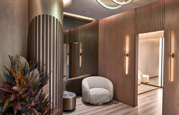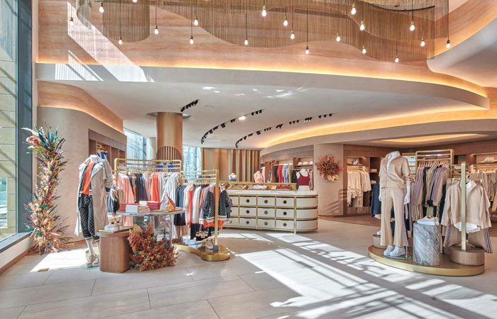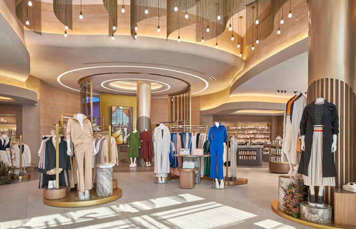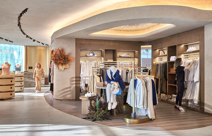 Generously sized fitting rooms also elevate customer well-being, with purposefully designed lighting that ensures people feel comfortable. Other thoughtful details include charging points, shelves for bags, shoes & jewellery, and 360-degree mirror sight lines. Wrapped in padded upholstered walls with a statement full-height triple mirror, the design is luxurious and complements the apparel collection.
