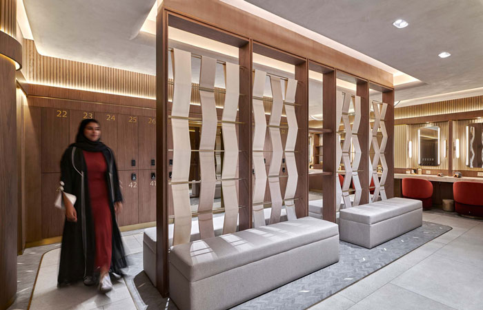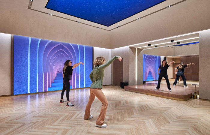 Kayanee is a fully immersive universe, with artfully designed modern facilities, dance studios, a retail space, and products and packaging. It is a community hub where women can connect, gain confidence, and express themselves, delivering a definitive “Move and Be Moved” experience. At the heart of Kayanee’s offerings lies the Kayanee Dance Fitness class (KDF), a proprietary fitness method created in collaboration with Zumba that celebrates the joy of movement and embodies the rich tapestry of Arabian music and dance. The dance studios combine a warm natural aesthetic with a state-of-the-art audio and visual experience. Adaptive lighting and dynamic LED screens on the walls and ceilings can transform the space from a beautiful sunrise in the morning to an expansive star scape for evening classes. Smart mirrors capture the activity of the class and display real-time performance and progress information to class participants.