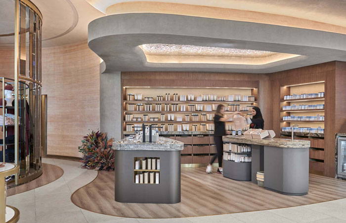 The front of the store features an F&B area offering a health-forward dining experience, creating a space where social engagement is equally important to personal well-being. A dedicated diagnostics area also allows customers to explore their personal health needs and body shapes to ensure they know what is right for them. A range of nutraceuticals such as vitamins, protein supplements, and probiotics are on offer. Set out in an apothecary-style display, visitors are encouraged to explore and test the products on the custom designed experience tables, with integrated sinks, tester pots, and hydration stations.