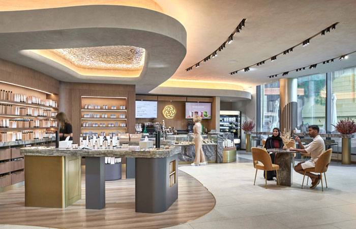 Taking centre stage in the retail area is the Kayanee showcase, which is an adaptive space designed to be configured in a variety of ways to facilitate the needs of the brand. Set within a circle, a large format digital display serves as a backdrop to two curved decorative glass screens that slide along a rounded track, creating a boutique-style product showcase, as well as an area for fashion catwalks, private collection viewings, and dance recitals. Kayanee also offers a curated programme of community events, such as TED talks and workshops on personal finance, nutrition, and wellness, which foster shared learning and growth.
