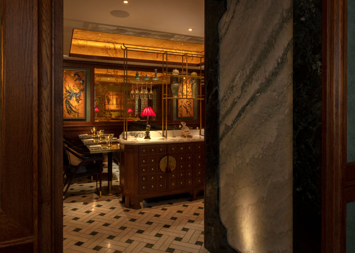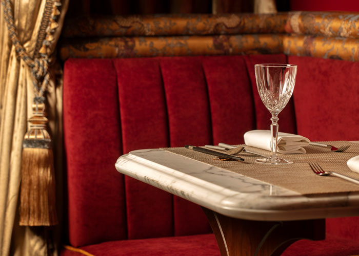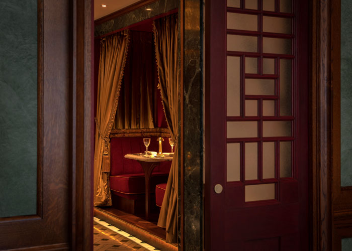 House of Ming will feature two sets of love seats, with their own velvet curtains to create a unique intimacy. The romantic two-seater booths feature a brass bespoke crafted button by Nocturne Workshop that discreetly calls the kitchen for champagne or the request for privacy. The golden seats are trimmed in Opium fabric by Nobilis, The marble tables sit under brass “twisted gingko” pendant light designed by Atelier Wren and made by Nocturne Workshop and is guaranteed to be one of the most romantic dining experiences in London.