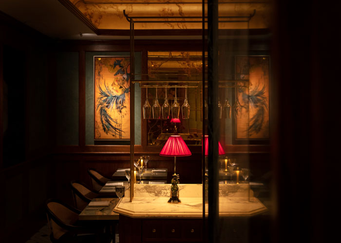 The intimate 58-seater restaurant has a stunning blend of green hues and lush red lacquer enhanced by a verre eglomise made by Anna Didik in South London, referencing the designs by Lara Fiorentino.