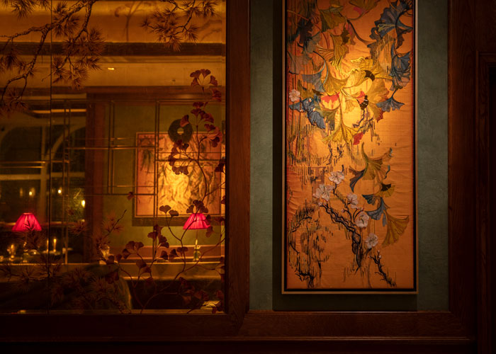 Ceilings were hand painted onto canvas by Lara Fiorentino, designs were inspired by Chinese silk screen painting from the Ming dynasty and feature pine trees, mountains and ginkgo leaves. The gold is used to warm the space and offset against the rich green and reds of the wall finishes and upholstery.