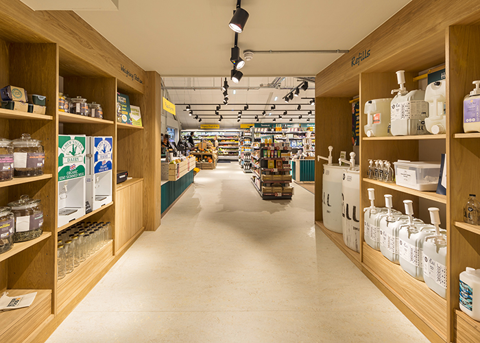 The new outlet needed to incorporate three main areas – a deli, refill area (where shoppers bring their own containers to access a whole range of ingredients) and a retail warehouse area, as well as back-of-house space, a staff room and washrooms. The long storefront at the new location permitted two entrances, so that customers can enter the deli area, where takeaway food and a small 14-cover café area is located, or go directly to the retail warehouse area to shop.