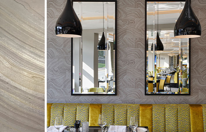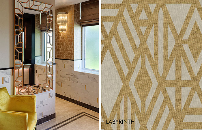 Moving through the restaurant, white and gold tiles trimmed in black are installed alongside Tektura’s Labyrinth wallcovering.