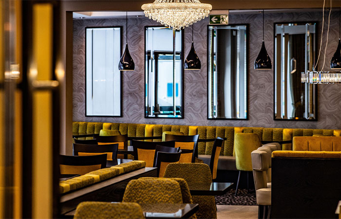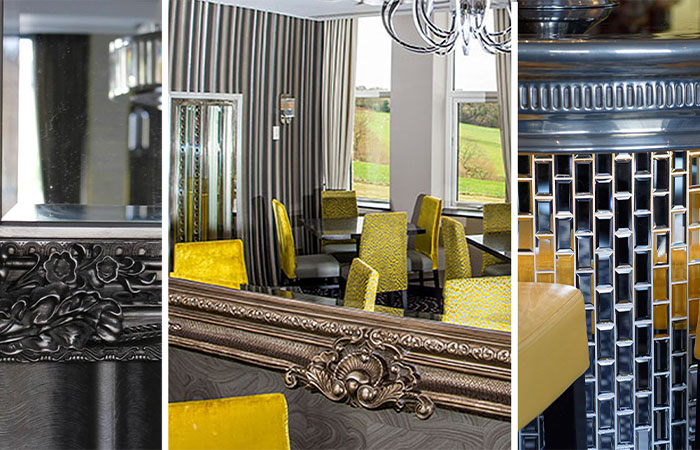 Mirror frames are either minimalist or elaborate, while the bar has a zinc surround and granite top. Concealed LED lighting illuminates the bar front and mirrored tiles.