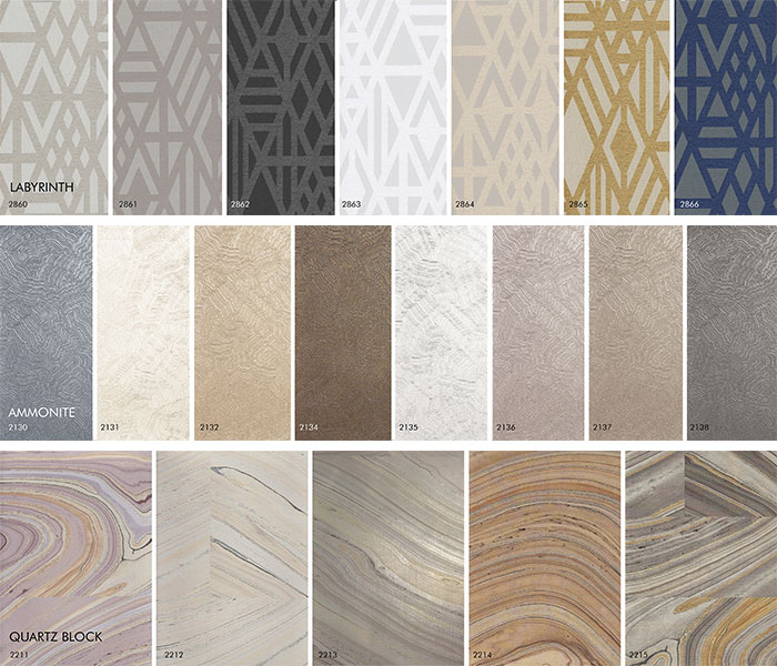 All of Tektura’s wallcoverings conform to fire ratings for public areas, are scrubbable and can be cleaned with diluted bleach. Click on these links to find out more: quartz block, labyrinth, and ammonite.