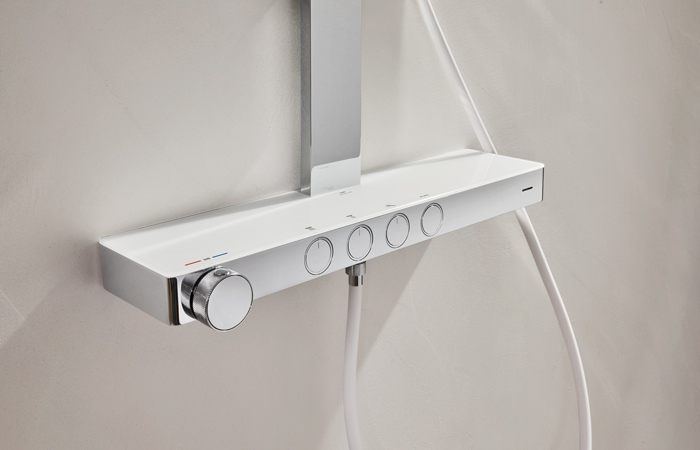 All other colours come with black glass accents. The shower system can be complemented with a shelf made of high-quality safety glass and metal. It is adjustable in height, offering additional storage space while also enhancing the shower’s aesthetics. Thanks to this customisable design versatility, GROHE Rainshower Aqua Pure extends the reach of the high-quality GROHE SPA portfolio and matches perfectly with other GROHE SPA lines like GROHE Allure—for a harmonious, coordinated space that emanates calmness and serenity.