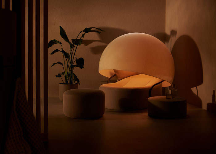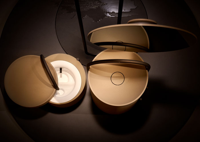 SPHERE is the conceptual area of the bathroom used for mental retreat, which includes an inviting armchair with a flexible dome. The dome creates a multi-sensory experience through an interplay of light, sounds and warm water vapour infused with essential oils, with the minimal consumption of water, energy and thus fewer CO2e emissions. There is also the ability to open or close the dome, which creates different states that impact the intensity of the experience, almost like a bathtub, but without wasting water and energy.