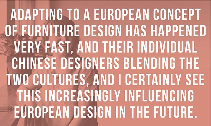 Chinese manufacturing skills have not always been associated with cheap products, this is very much a misconception of modern day Europe. Furniture design has been specific to their cultural norms and requirements. Adapting to a European concept of furniture design has happened very fast, and their individual Chinese designers blending the two cultures, and I certainly see this increasingly influencing European design in the future.’