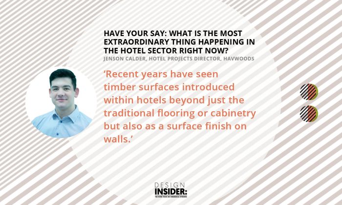 ‘Recent years have seen timber surfaces introduced within hotels beyond just the traditional flooring or cabinetry but also as a surface finish on walls. Whether this is smooth mix-match timber veneers, textured reclaimed cladding or more intricate 3-dimensional milled panelling. We are seeing a trend for timber to be used not by exception for a feature wall, but across all interior vertical surfaces including hotel rooms, corridors, stairwells, lifts and public spaces.’
